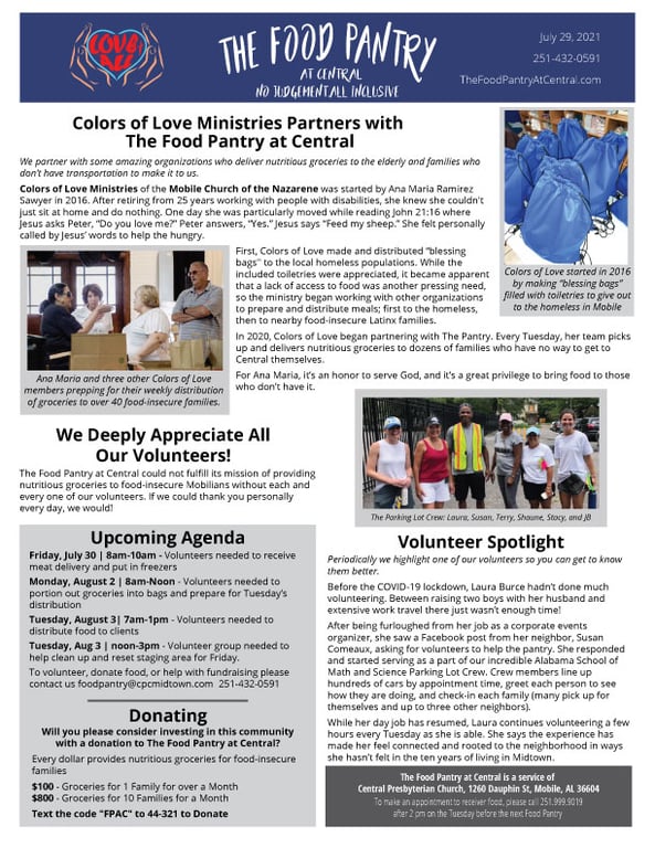 The Food Pantry at Central could not fulfill its mission of providing nutritious groceries to food-insecure Mobilians without each and every one of our volunteers. If we could thank you personally every day, we would!